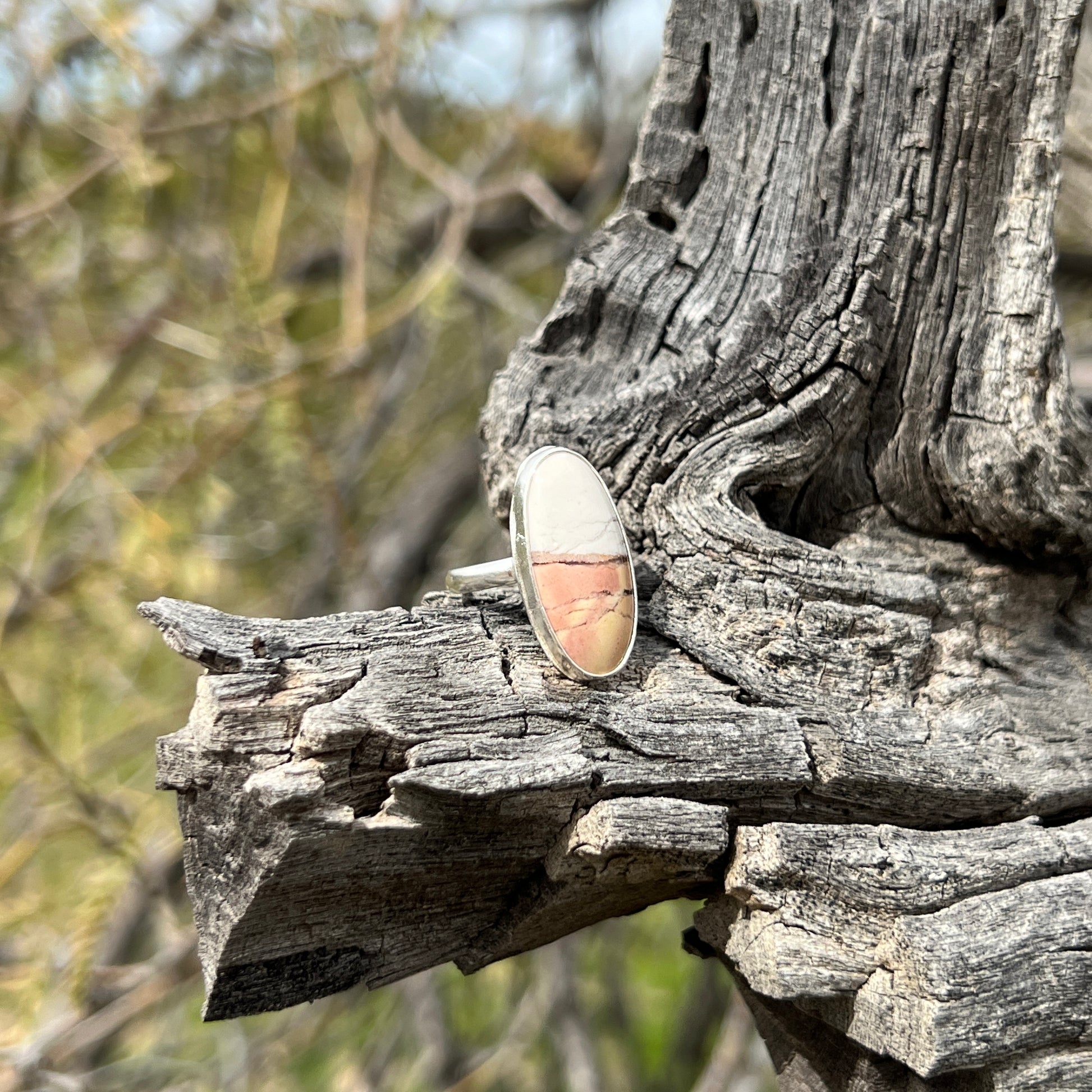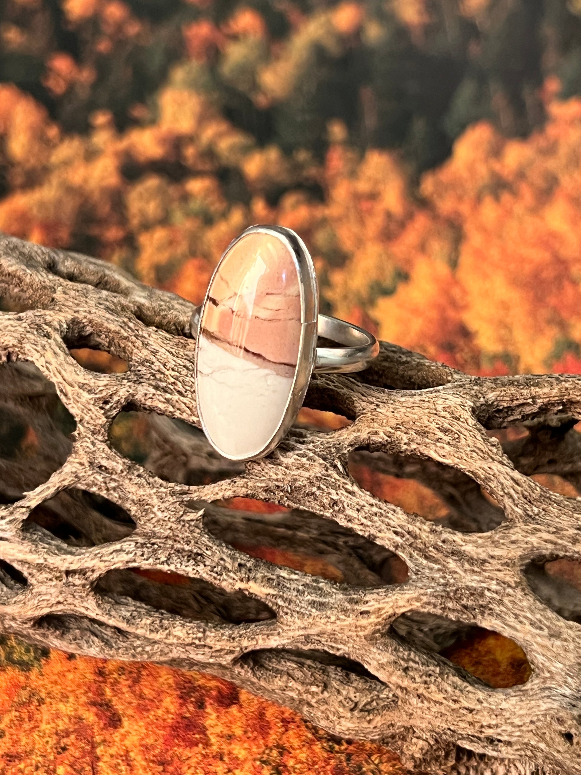 This beauty looks like a pink sunset over a snowy mountain. Rare peachy pink and white Australian Outback Opal, handmade in Sterling Silver. Simple and elegant. Size 7.