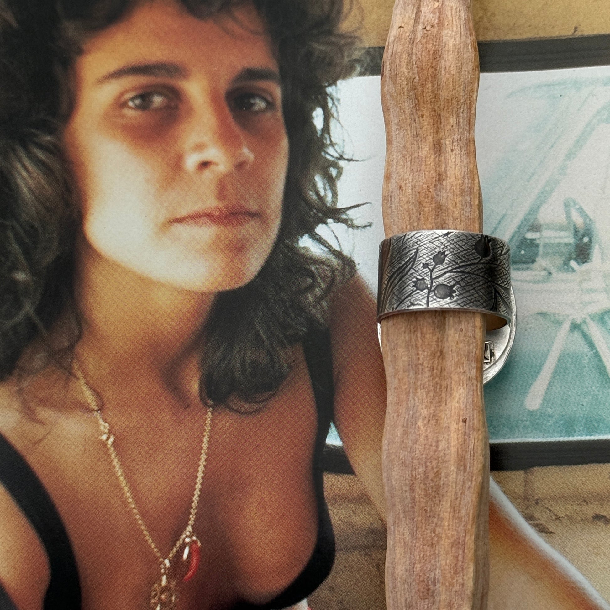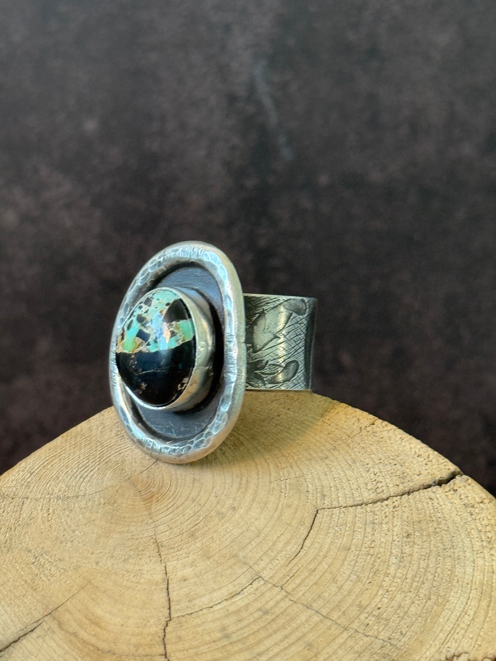 One of a kind hand fabricated sterling silver ring with a unique Blackjack turquoise cabochon, will fit size 9 1/2 - 10.