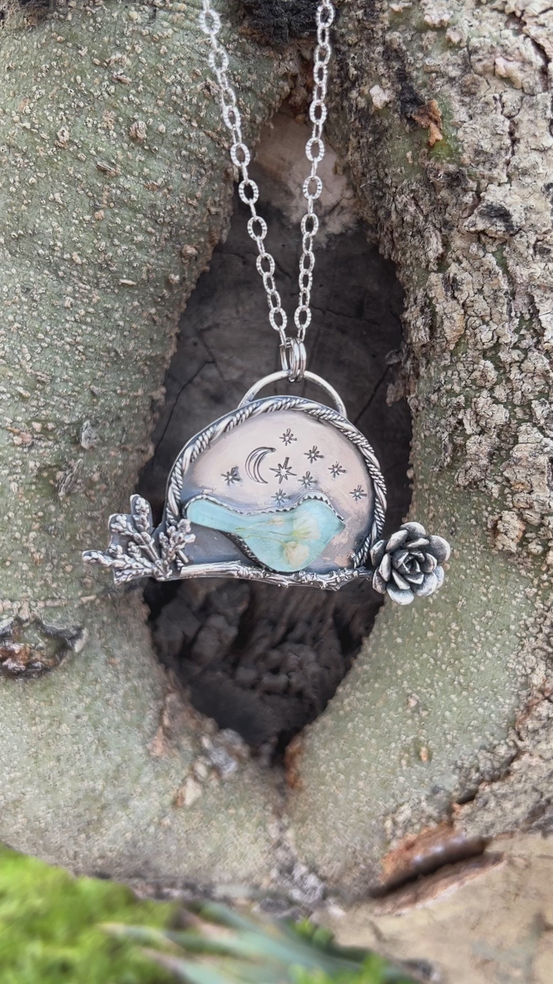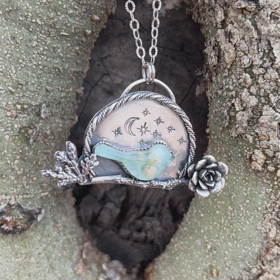 Cute blue bird on a branch, artisan crafted necklace in Sterling Silver. The branch, flower (succulent) and greenery are solid sterling silver castings made from real life nature! The bird is resin with dried flowers. The sterling silver background is stamped with a crescent moon and stars. Starry Night wearable art for Bird Lovers.