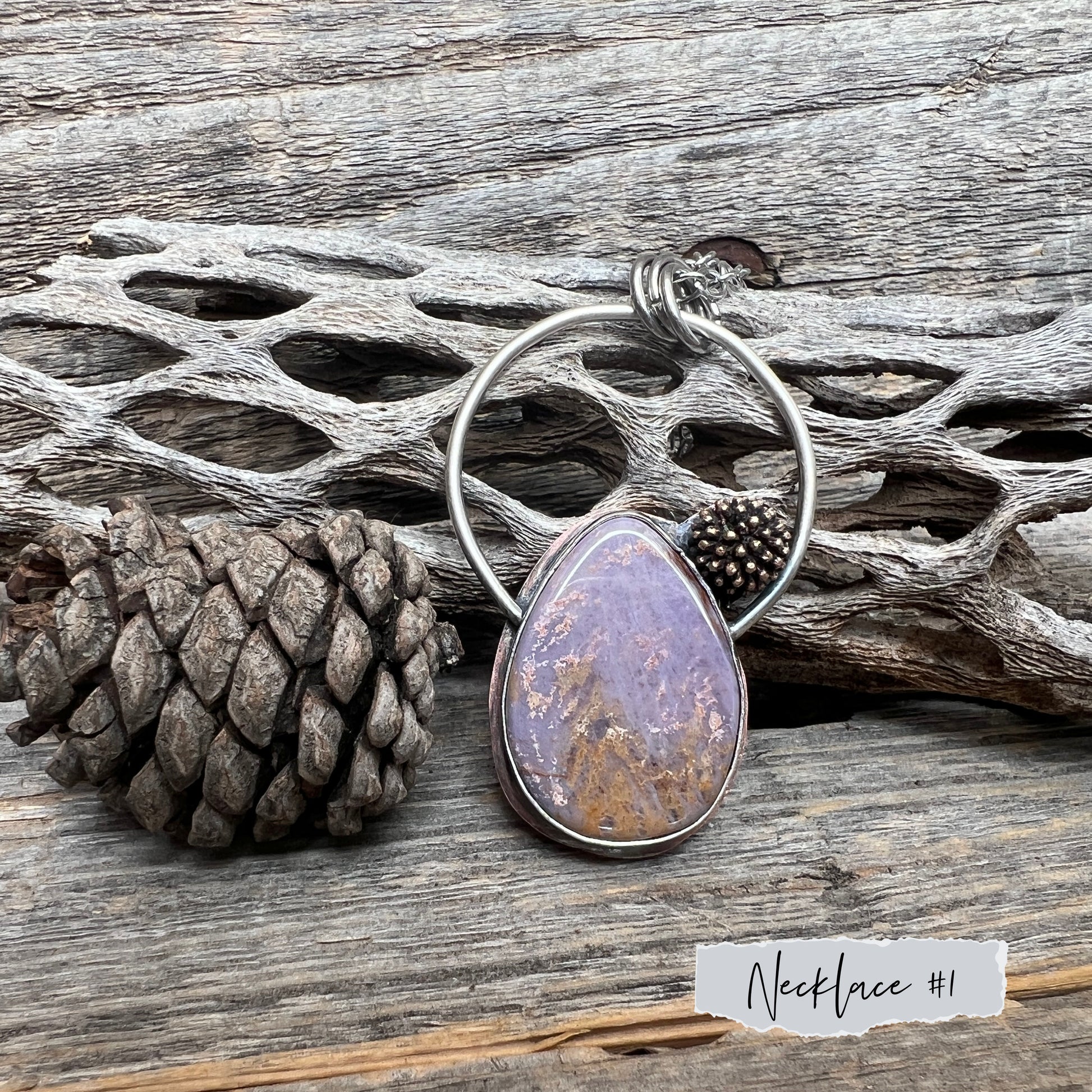 These necklaces are part of my Violet collection, named after my friend's little girl. The collection includes 6 Burro Creek jasper cut by a local woman, and 1 Tiffany stone and 1 Burro Creek jasper cut by a local man. Burro Creek jasper was mined right here in Arizona. The high quality and rare Tiffany stone is from Utah.