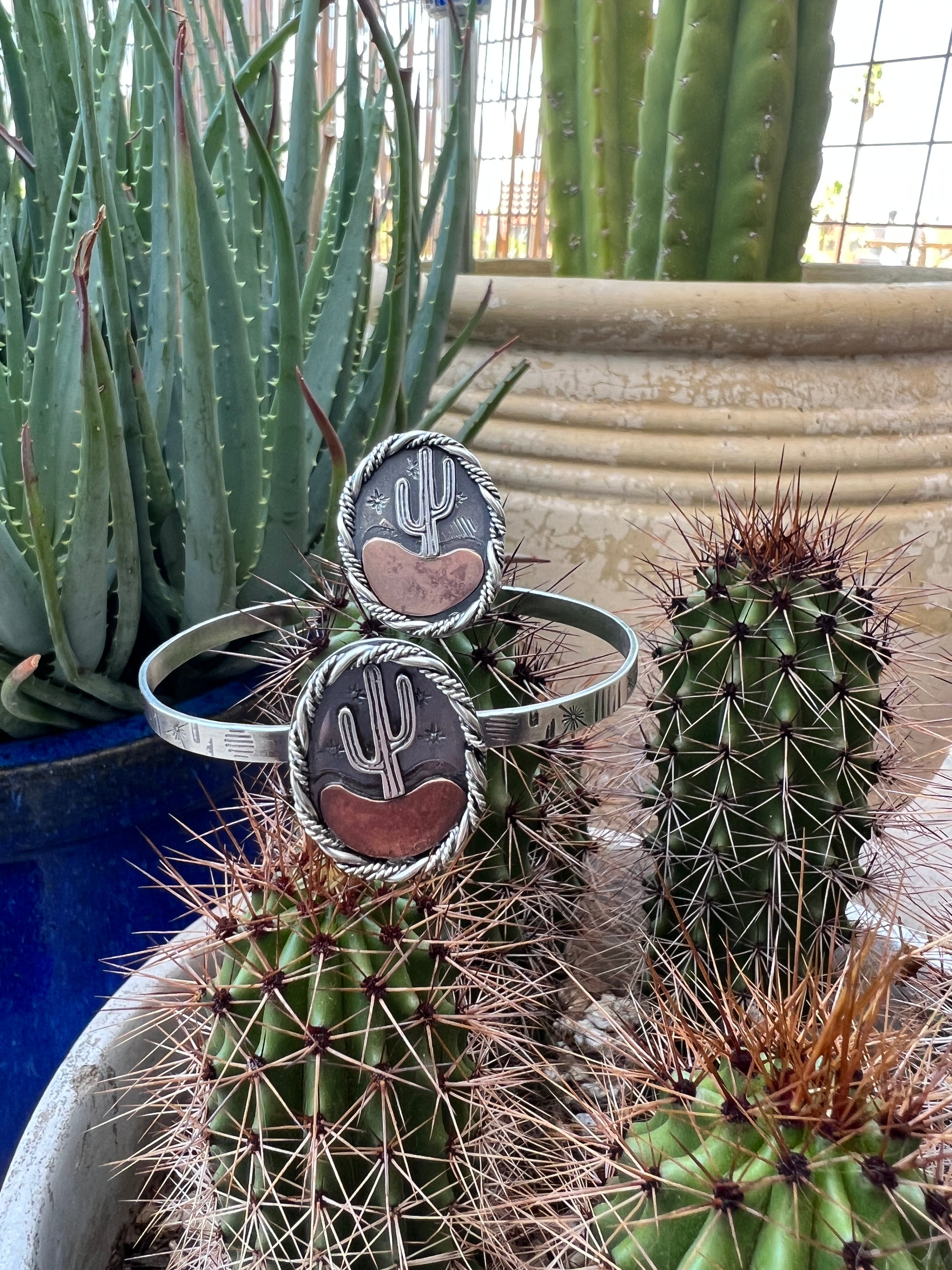 I made two desert scenes with Sterling Silver and bronze, one became a ring, and the other a cuff bracelet. I moved to Arizona in 2015, and I'm still in awe of the Saguaros, and our desert sky at night. Our sunsets are fiery and tranquil at the same time. The stars are visible even in the city, and lightning storms are captivating!