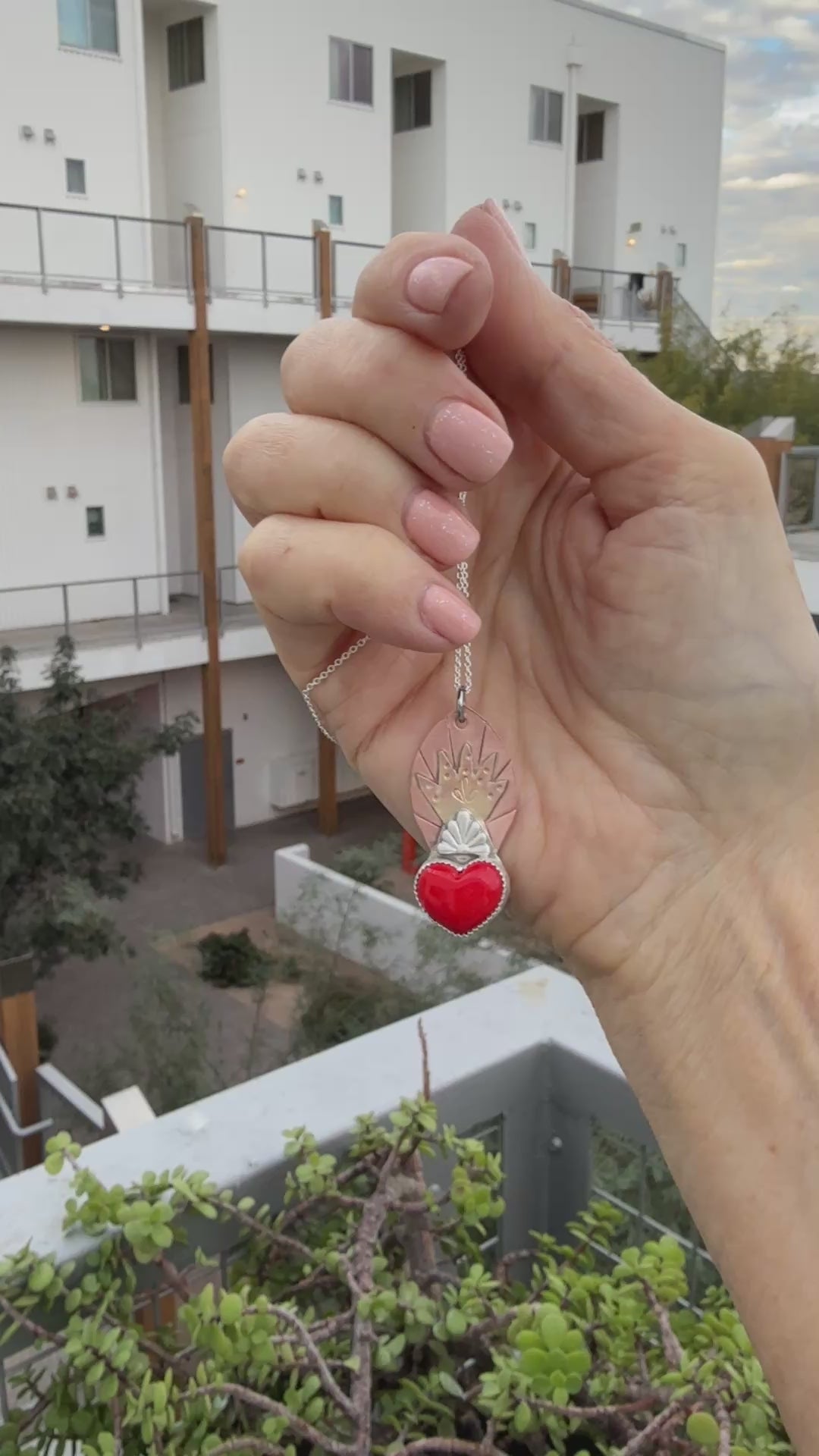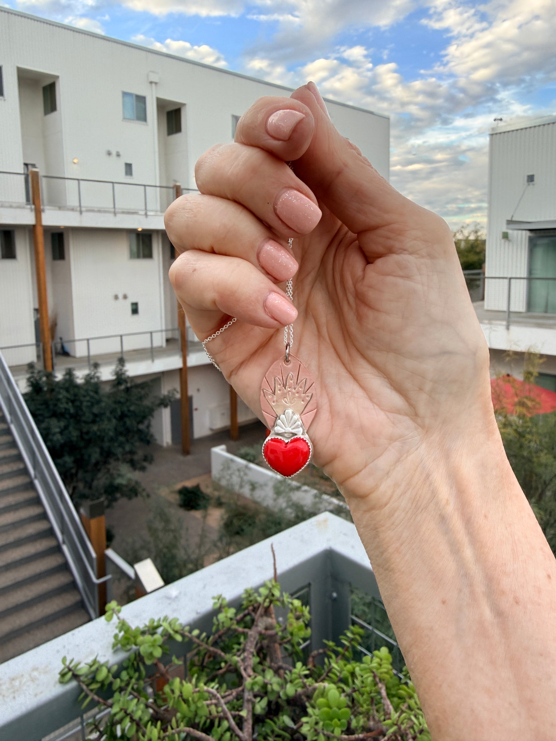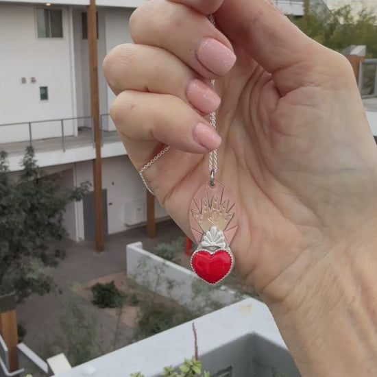 A one-of-a-kind sacred heart pendant in mixed metals with a vibrant red heart and flame details. Each piece is as unique as the person who makes it!