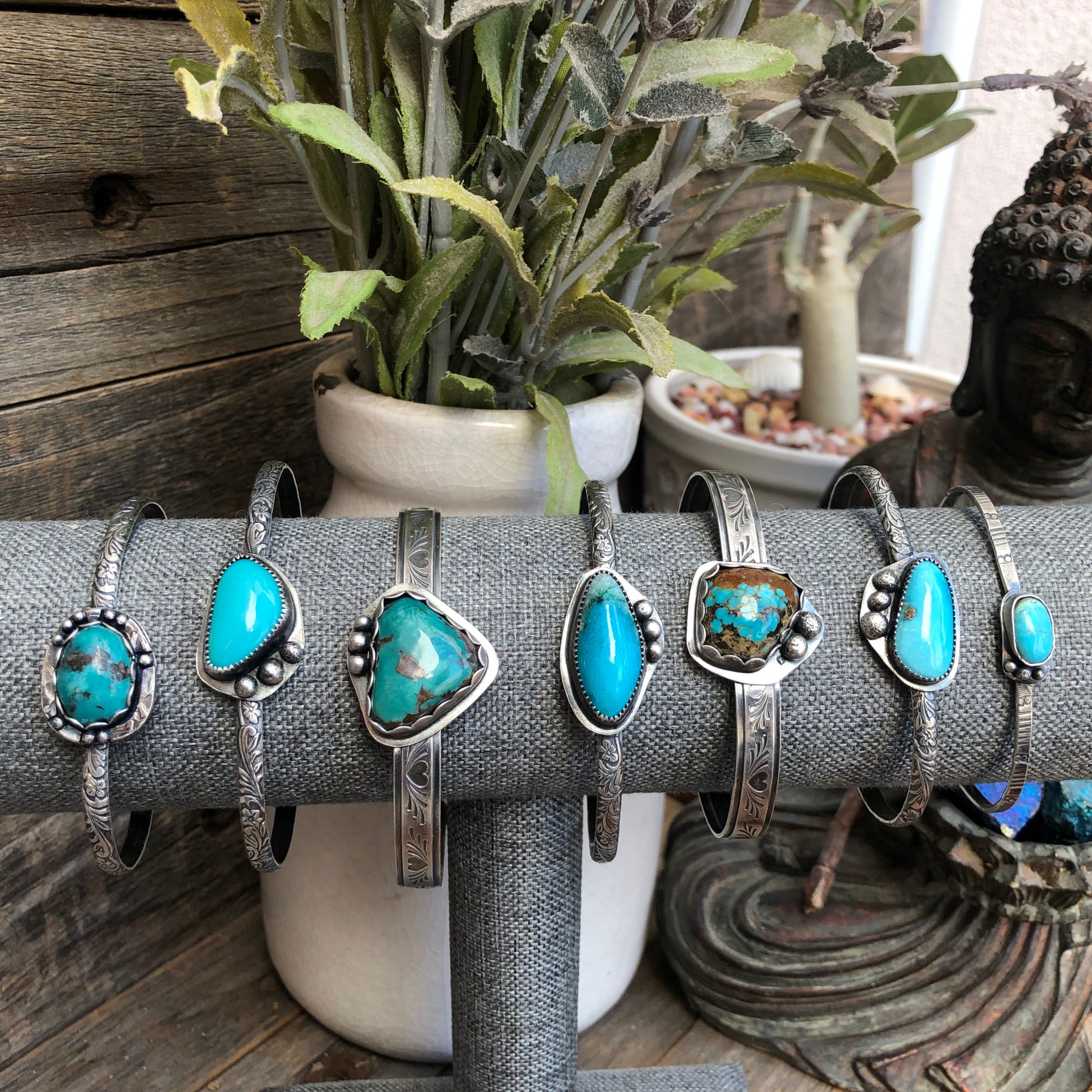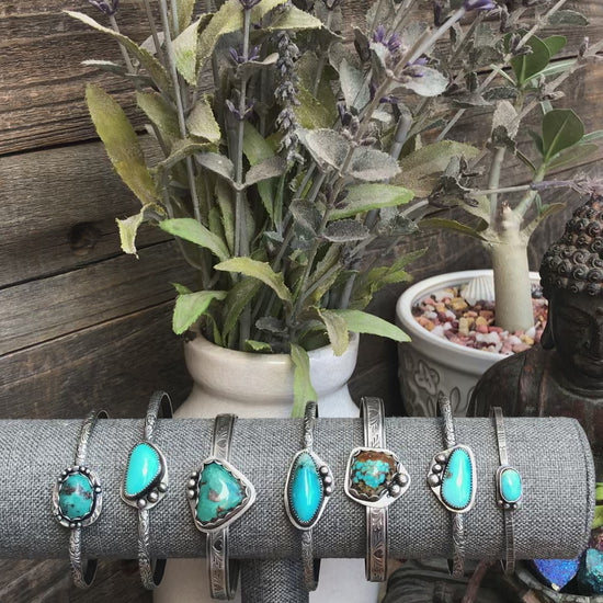 Beautiful blue Kingman turquoise from Arizona. I cut the turquoise cabochons, and fabricated these Sterling Silver bracelets. They are slightly adjustable. I am able to make these smaller if requested.