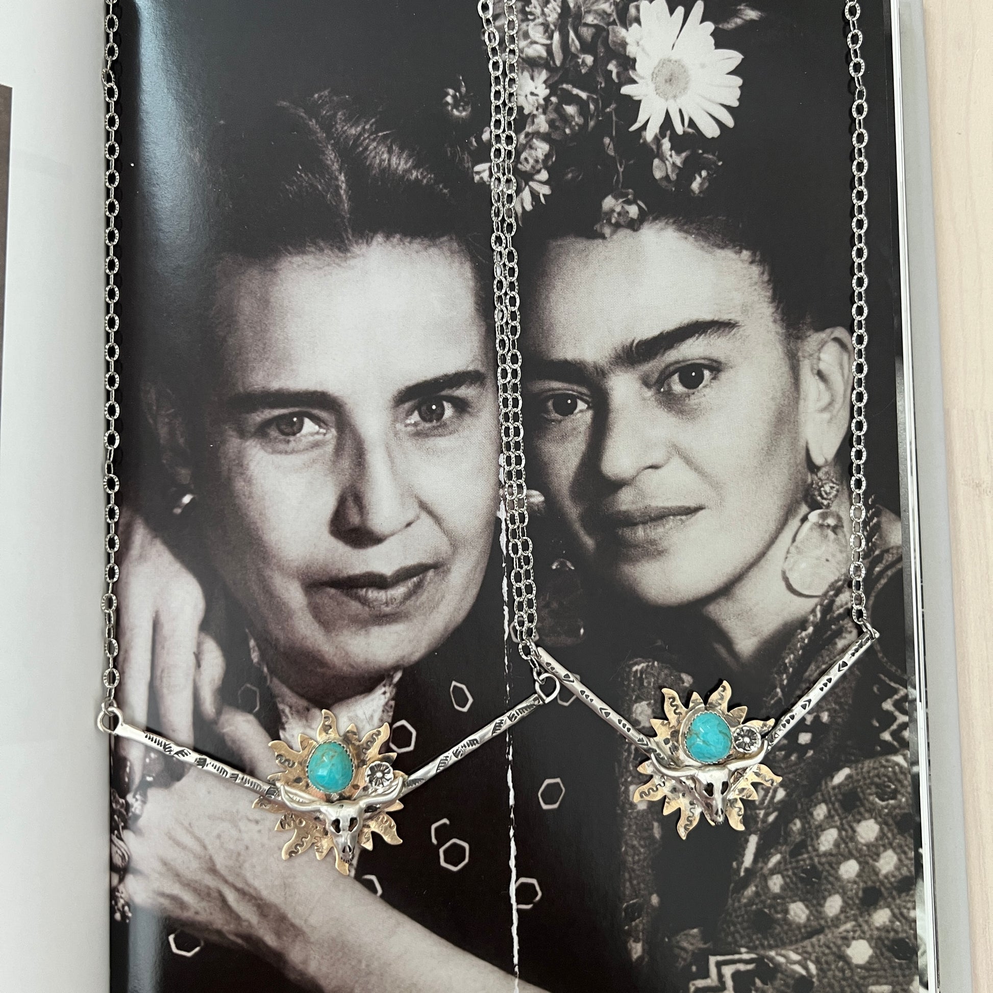 Southwest Vibes. These Sterling Silver longhorn cow skulls are set on a flaming sun backdrop made of brass, the remaining metal is all Sterling Silver. Each necklace has a flower above the horn, and a Kingman Turquiose cabochon.