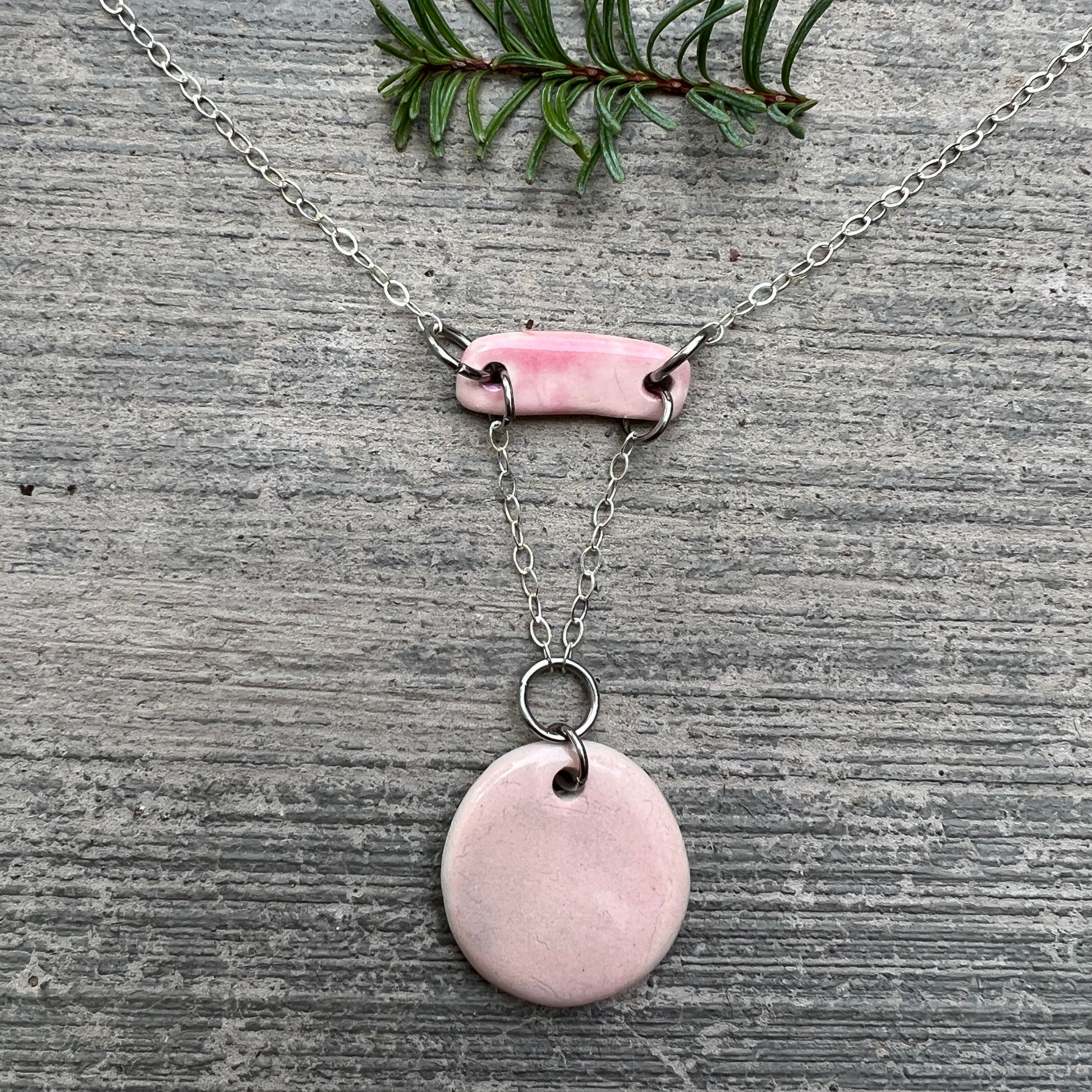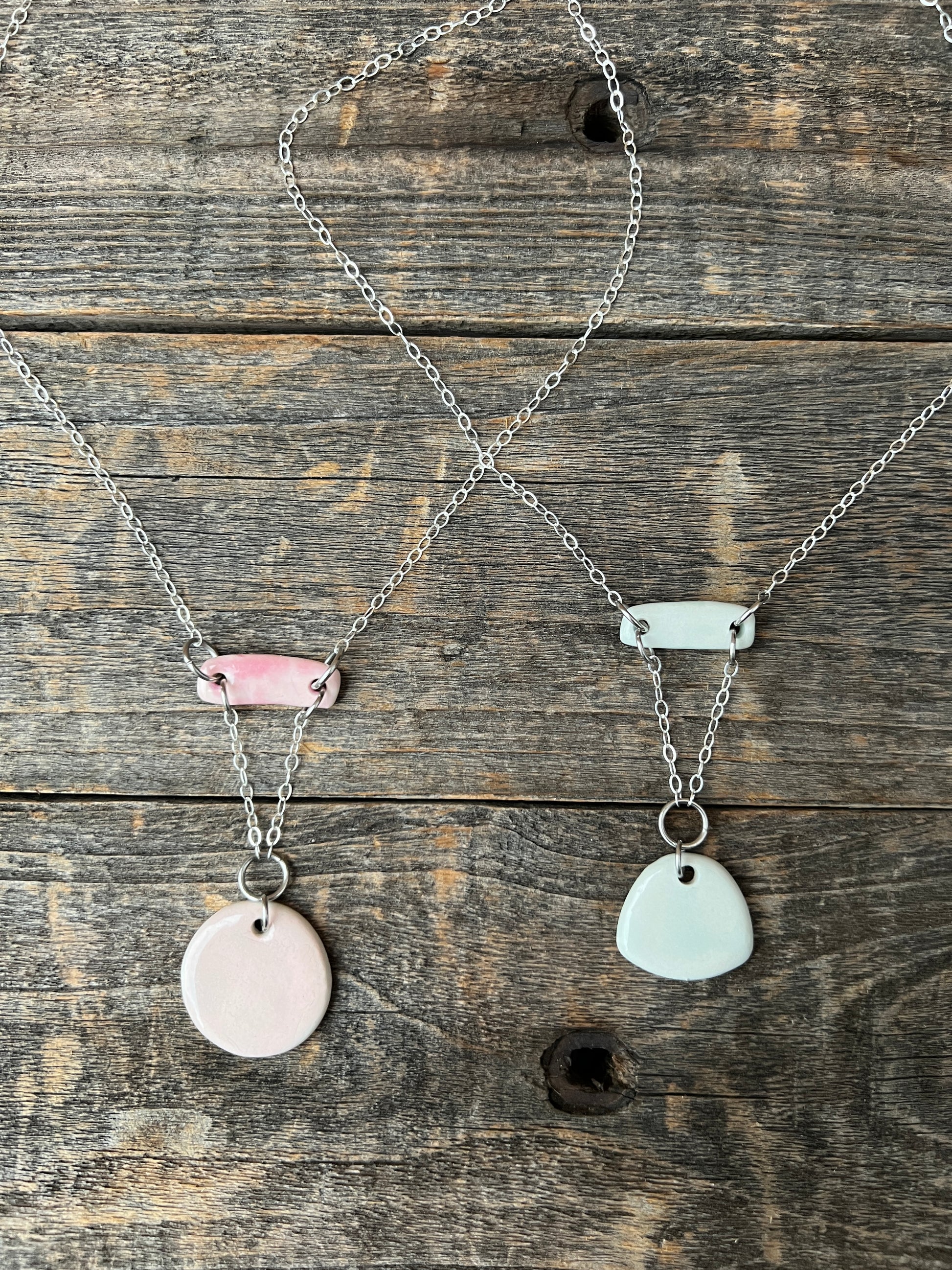 Handmade double pendant porcelain necklace in light pink or pale blue. 16" Sterling Silver chain necklace, drop length from top rectangle porcelain piece to bottom of round is approximately 2".