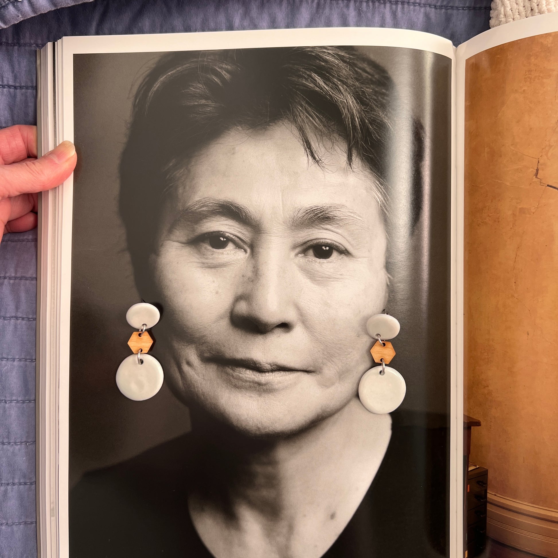 Pale blue porcelain & wood dangles, Titanium post earrings