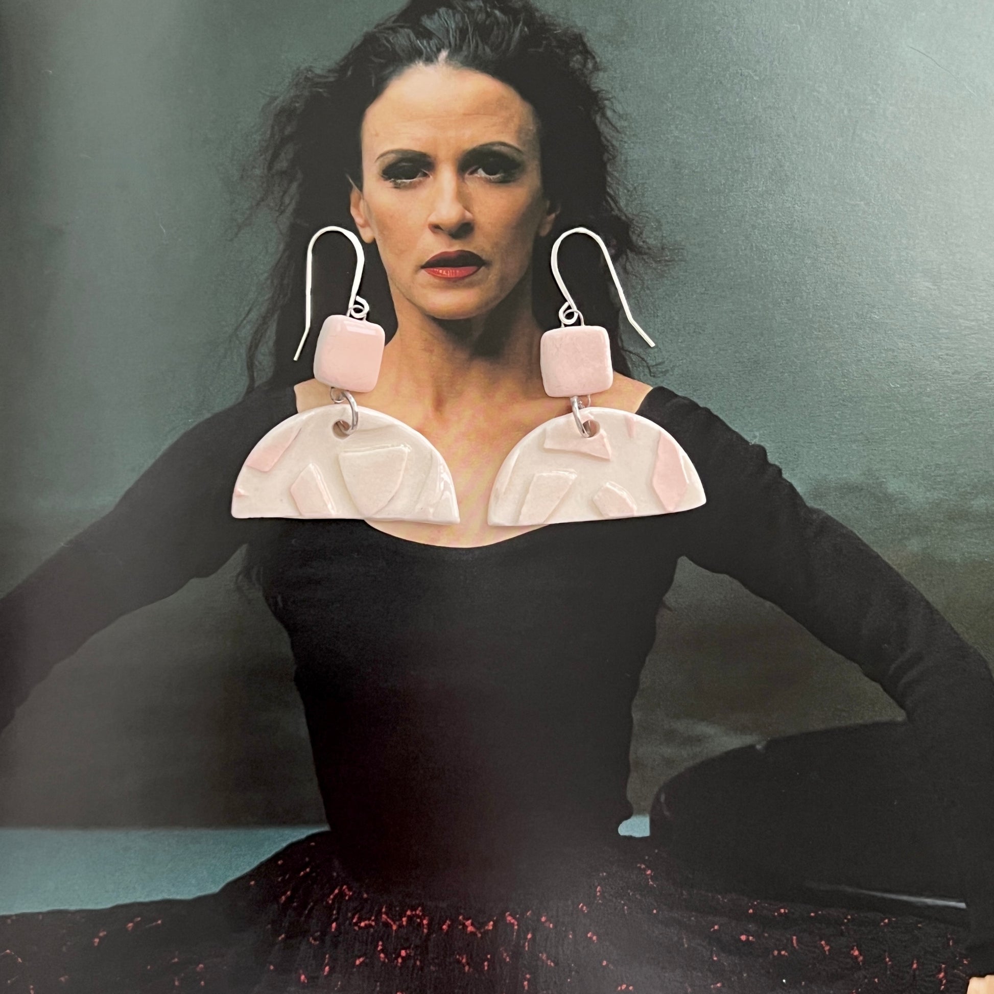 Handmade white and pink porcelain earrings, one of a kind geometric abstract design. Sterling Silver ear wires. Porcelain is the traditional and modern 18th anniversary gift, but is a good choice for any anniversary. Approximately 1 1/4"H x 1 3/8"W