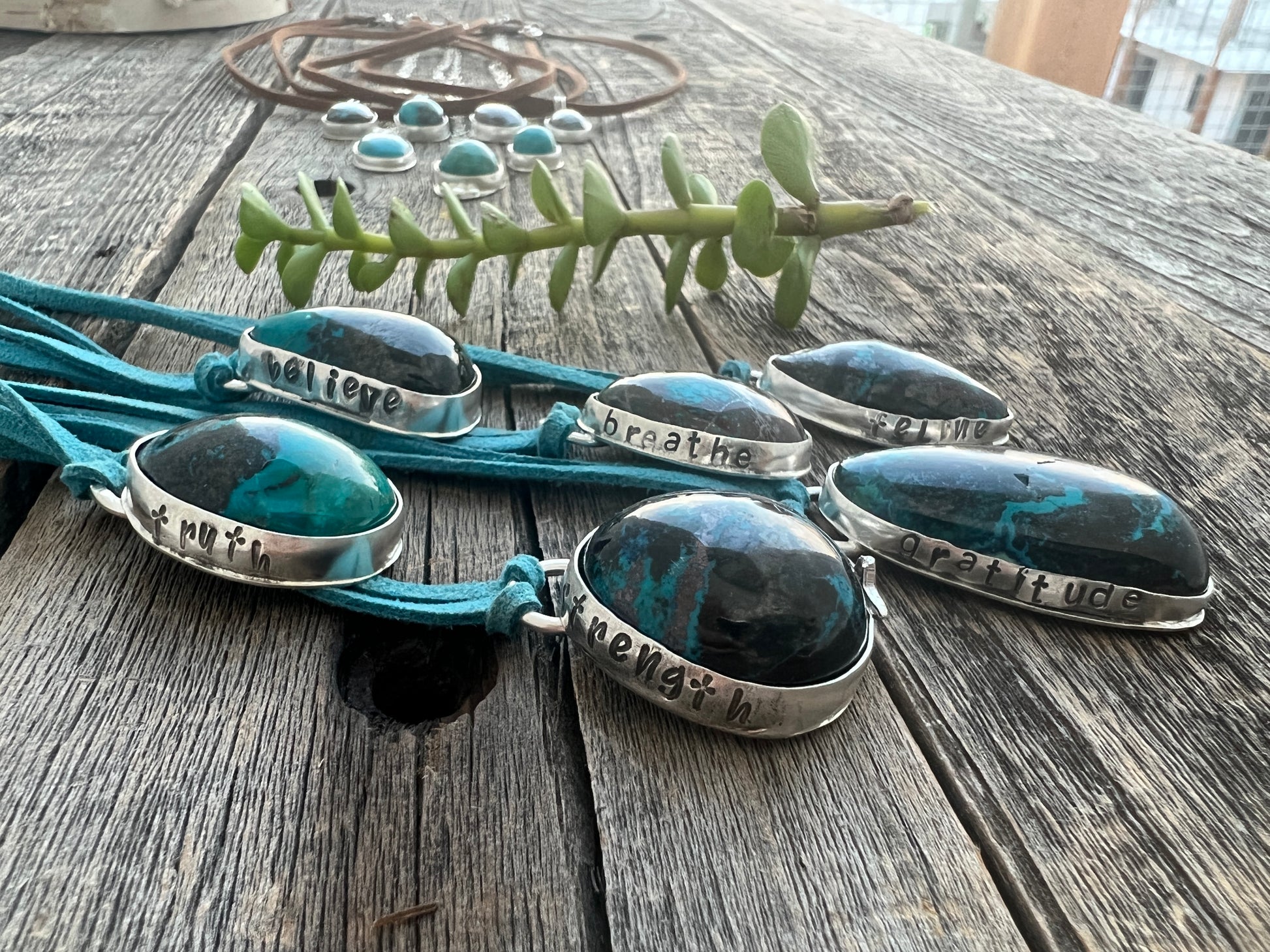 Beautiful blue RARE Bisbee Shattuckite from Arizona! Bisbee Turquoise mine has long ago closed and all turquoise claims sold. Specimens can sell for $20 - $100 a carat. The cabochons in these necklaces are not backed, they are 100% big fat gemstones set in a fine silver bezel with sterling silver backplate and bail. Positive affirmations stamped on the side of the bezels. The necklace is vegan blue suede, and is adjustable to wear long or short. Suitable for men or women.