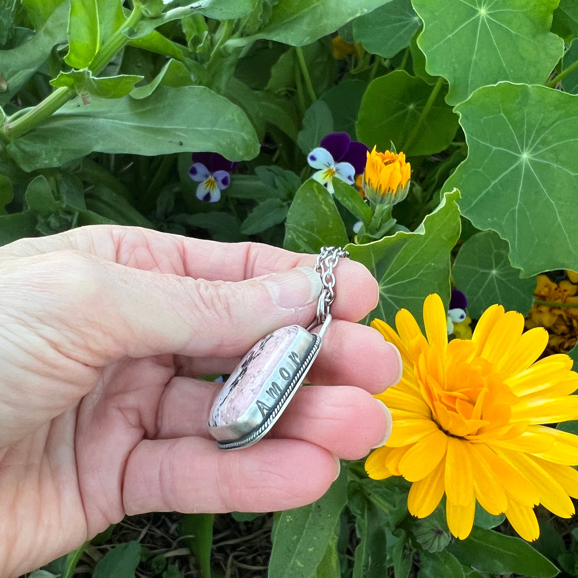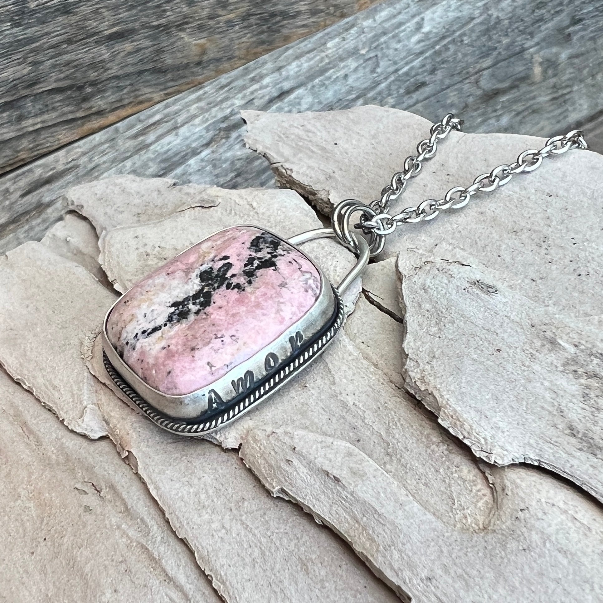 Rhodonite gemstone with Amor (Love) stamped on the side of the bezel setting. Sterling Silver pendant 1 1/2"H x 1"W. My NR (Naked Rebel) makers mark on back. Chain is 16" sturdy stainless steel with lobster clasp. I cut the stone and fabricated the pendant.