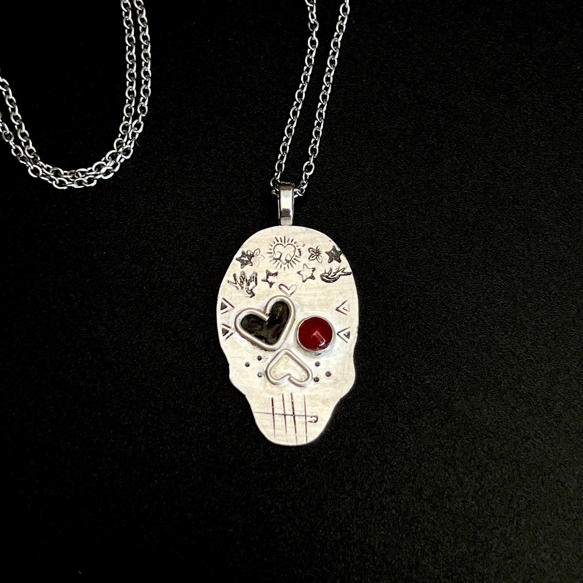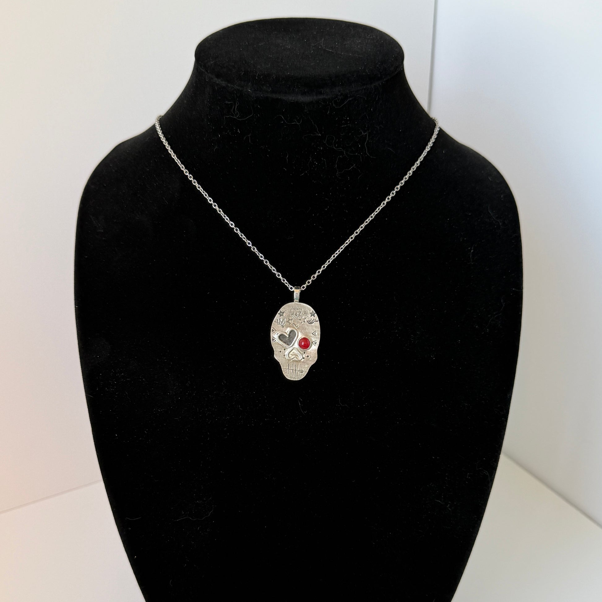 Sterling Silver skull pendant made for Dia de los Muertos. 18"-20" adjustable stainless steel chain with a petite sterling silver charm at the end of the chain.