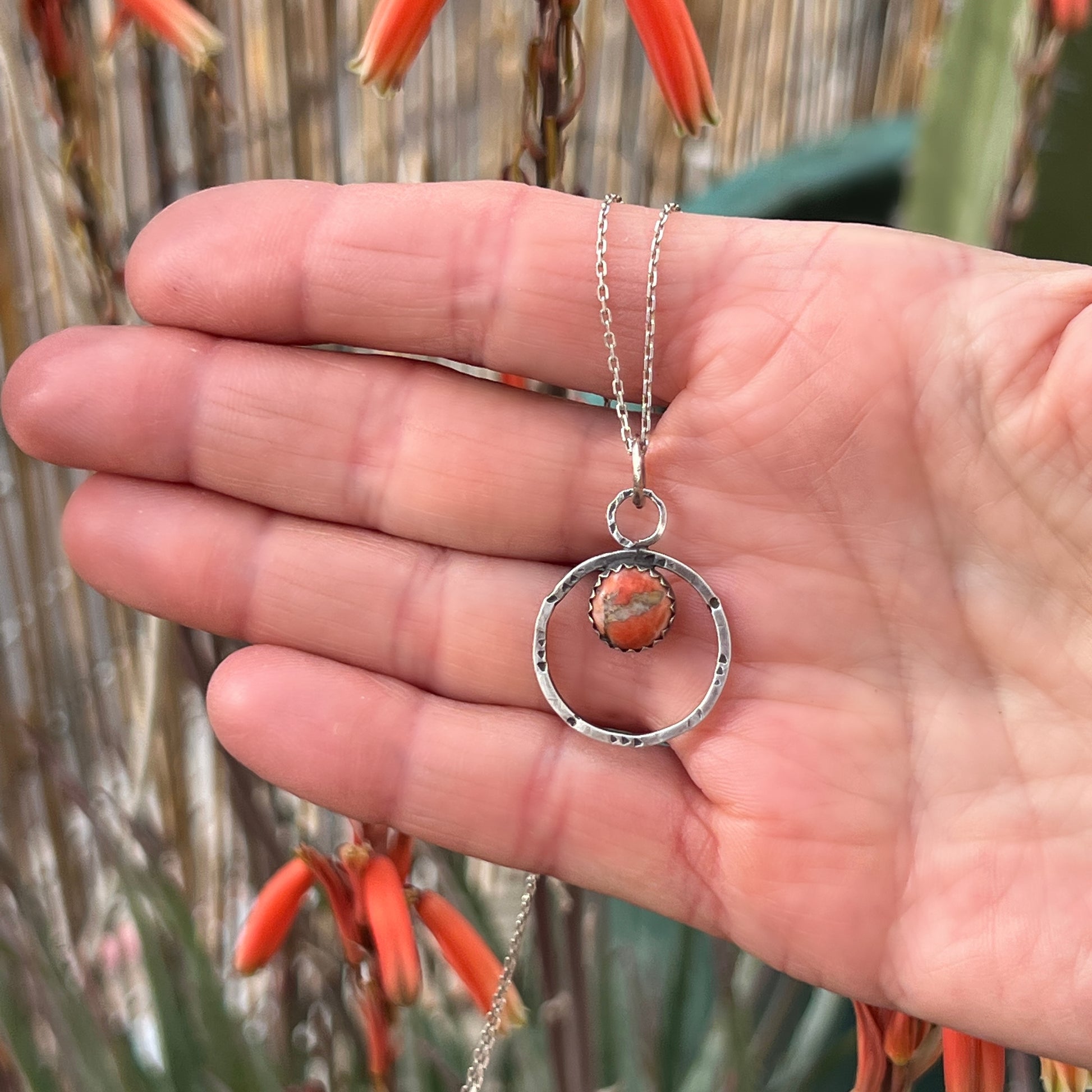 Spiny Oyster Shell within a Sterling Silver hammered texture circle, 16" necklace. The cabochon is 8mm, and the pendant is 3/4" round.