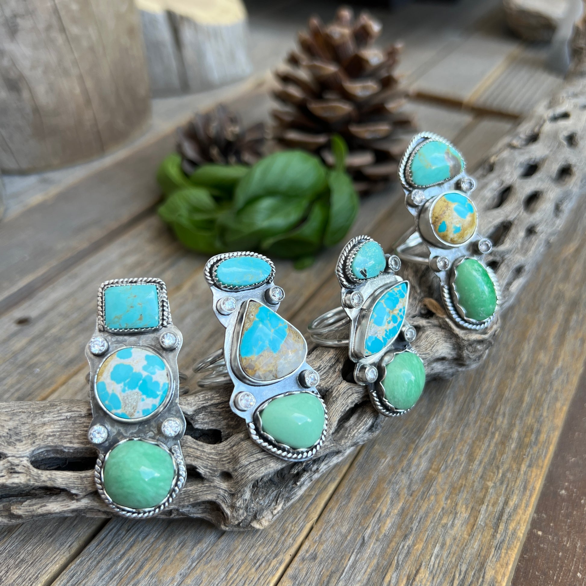 These magnificent triple stone Sterling Silver rings are eye catchers! A little bit rustic, a little bit bling. A little bit country, a little bit rock n roll! I went a little extra with these! Extra silver, gorgeous blue turquoise and green variscite, and cubic zirconias for extra Wow! Double shank, handmade Sterling Silver rings, each unique.