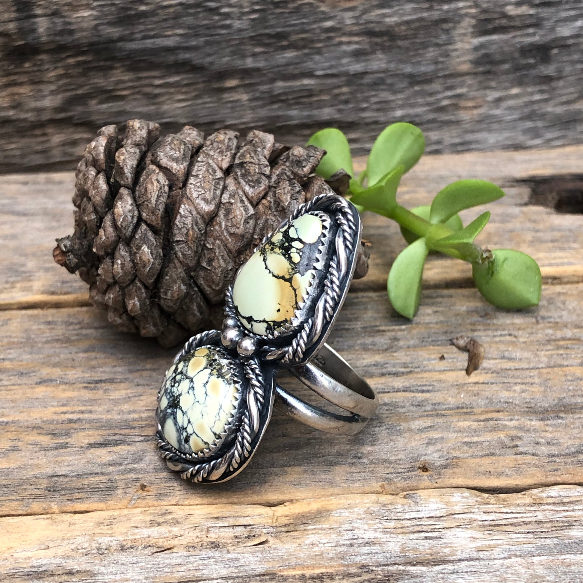 Double gemstone Sterling Silver ring with Tortoise Variscite from Nevada. Size 7.