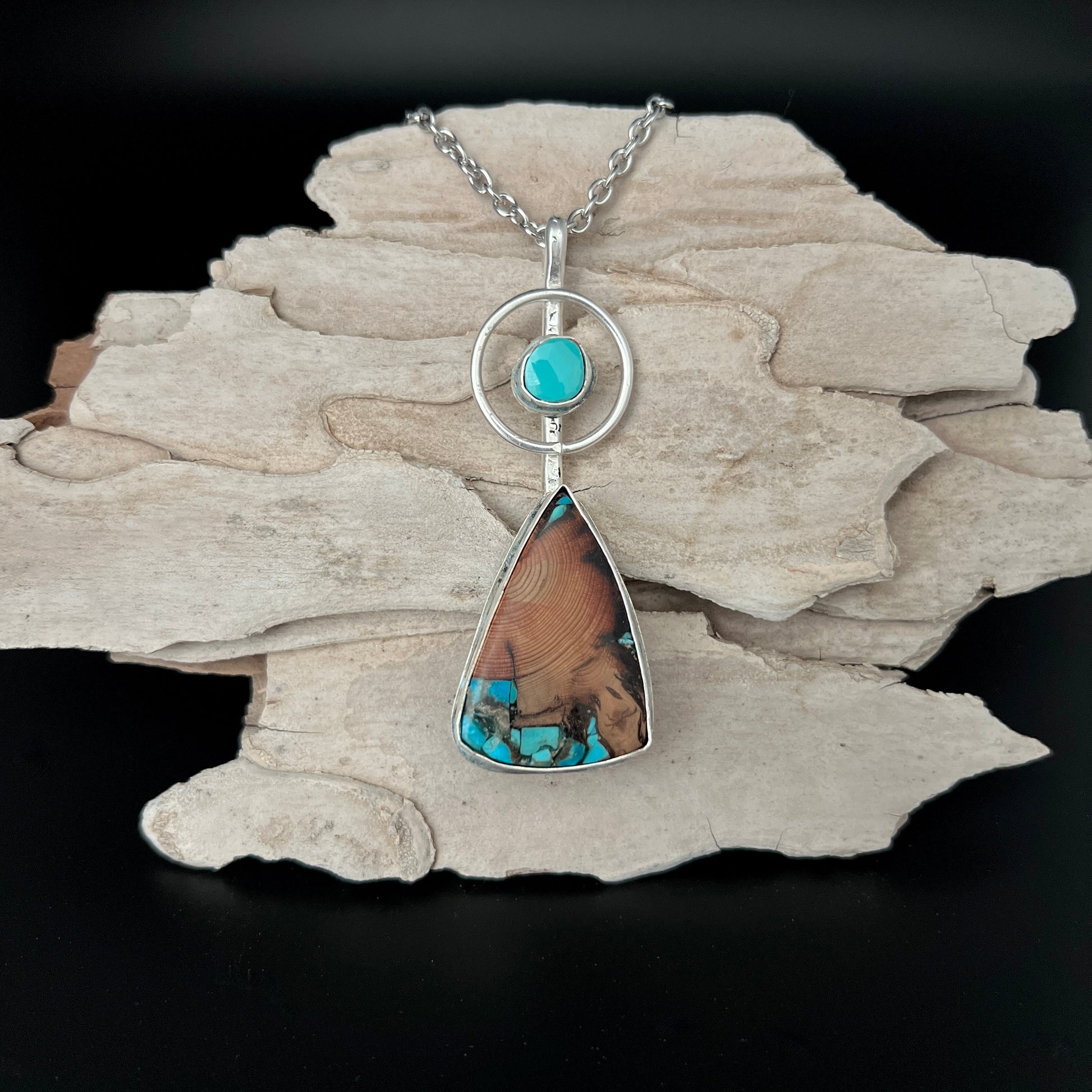 Nature inspired turquoise and wood handmade necklace. The top stone is Kingman turquoise, the lower is Douglas Fir wood with turquoise inlay, set in Sterling Silver. The chain is sturdy stainless steel, 16" The pendant is approximately 1"W x 2 1/2"L If you prefer a Sterling Silver chain, I can swap it out for an extra charge between $25-$50.