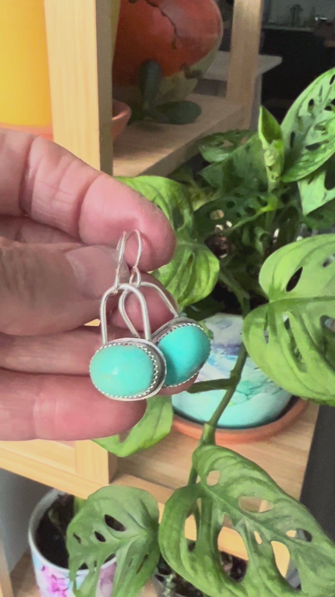 Handmade Sterling Silver Turquoise Mountain drop earrings. Cute turquoise dangles in blue and green.