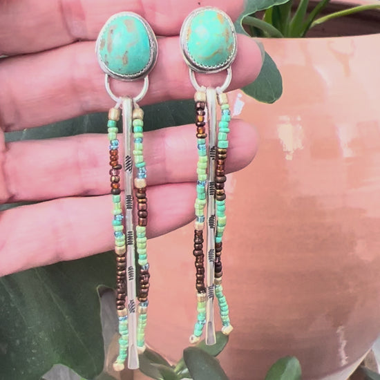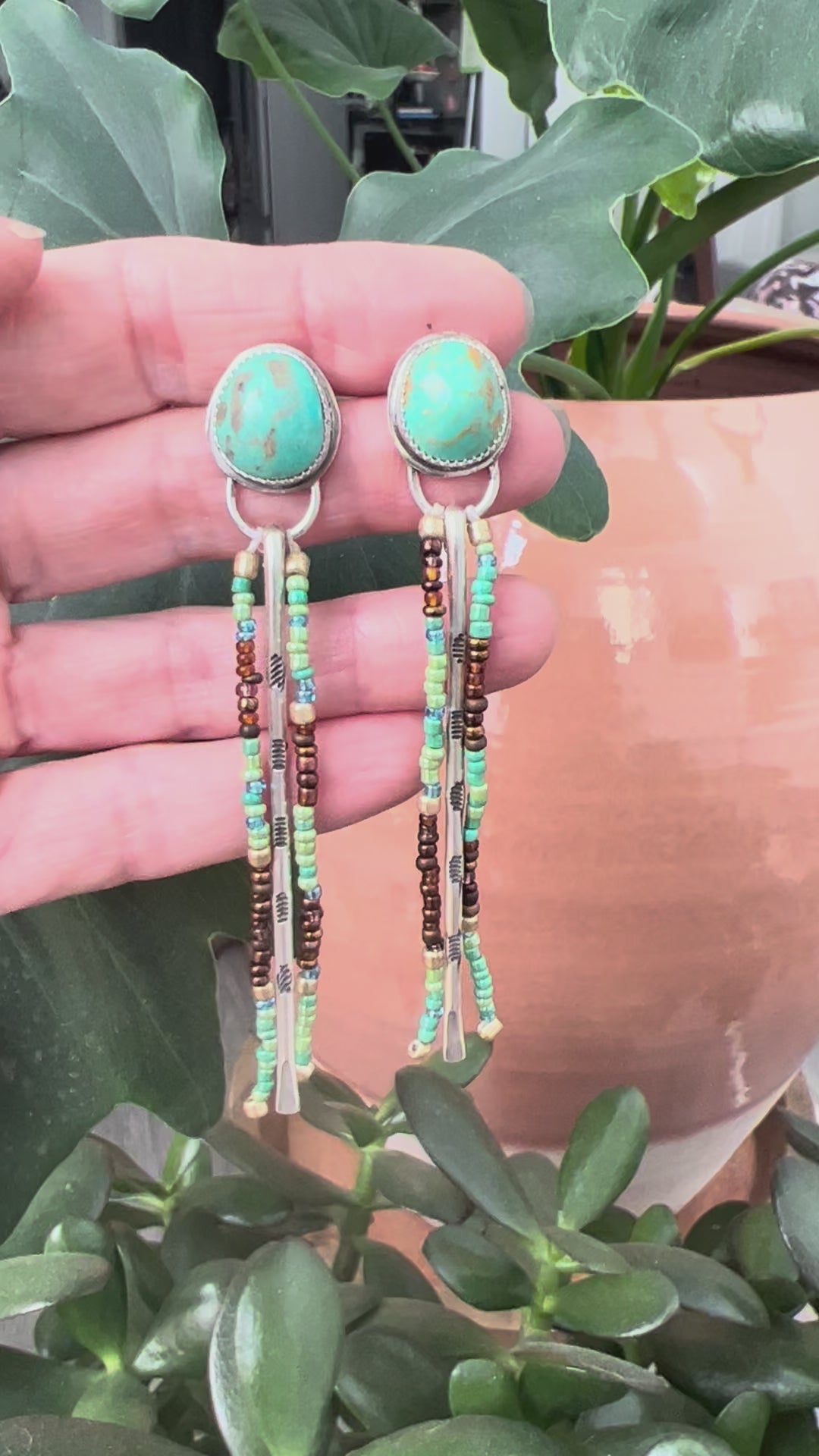 Turquoise Mountain earrings with beaded fringe: Sterling Silver