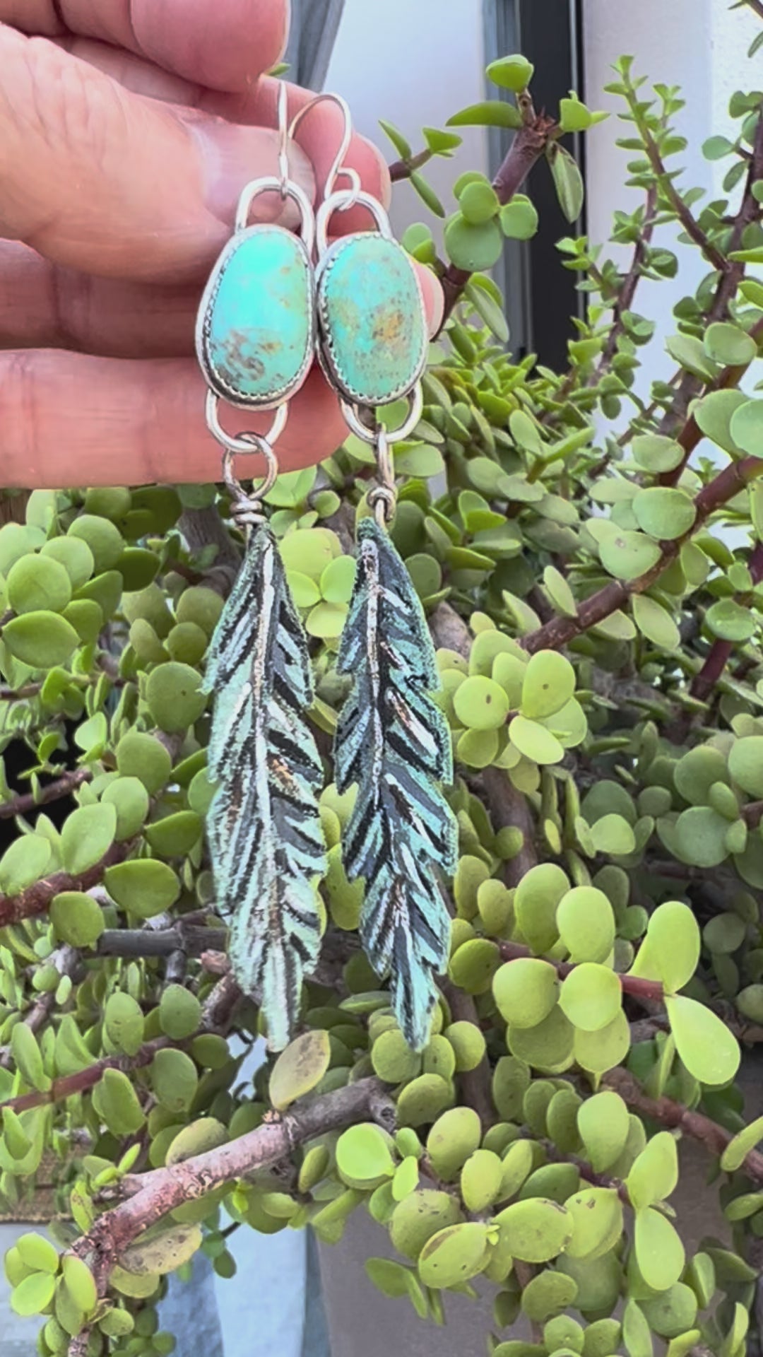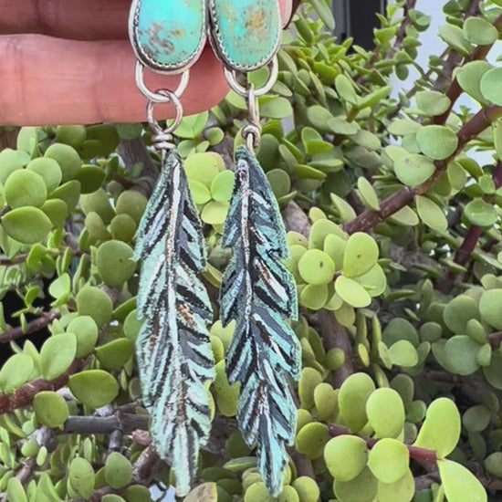 Turquoise earrings with hand painted leather feathers: Sterling Silver