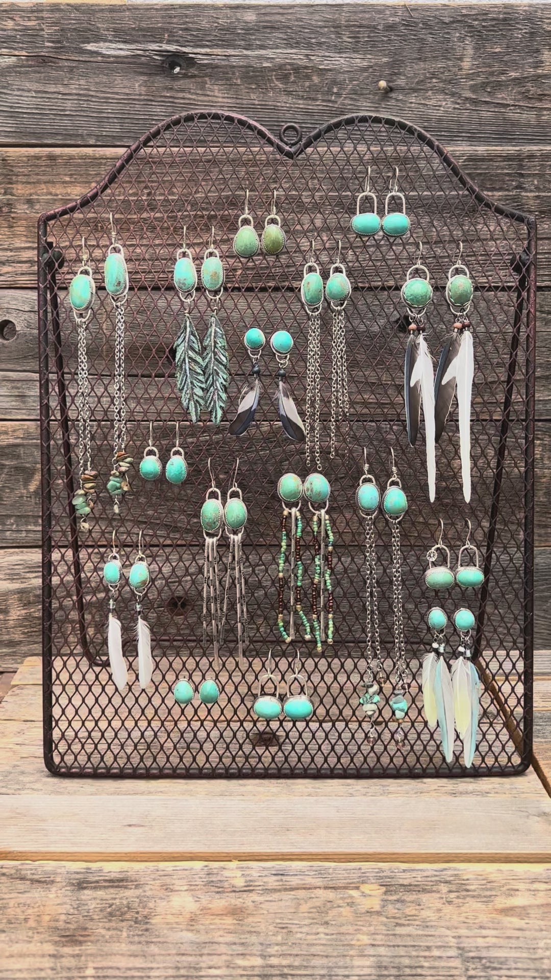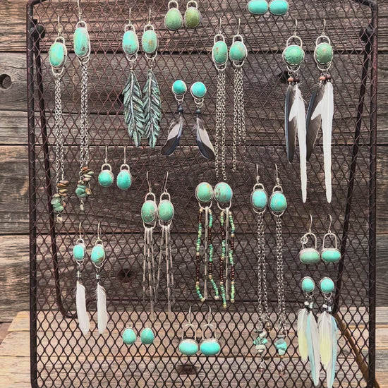 These beauties are high quality Arizona Turquoise Mountain turquoise set in Sterling Silver with rhodium chain dangles that have turquoise nuggets and mini beach stones at the bottom, along with Topaz crystals.