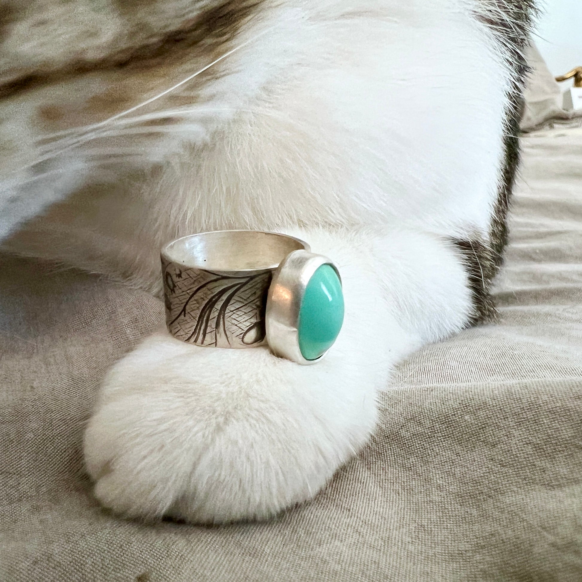 Turquoise Mountain turquoise comes from the Cerbat Mountains in Mohave County, Arizona. It belongs to the Kingman mine, but is a separate mine with yielding it's own unique color. I textured the wide Sterling Silver band and added a patina for contrast. This ring is size 7 1/2.