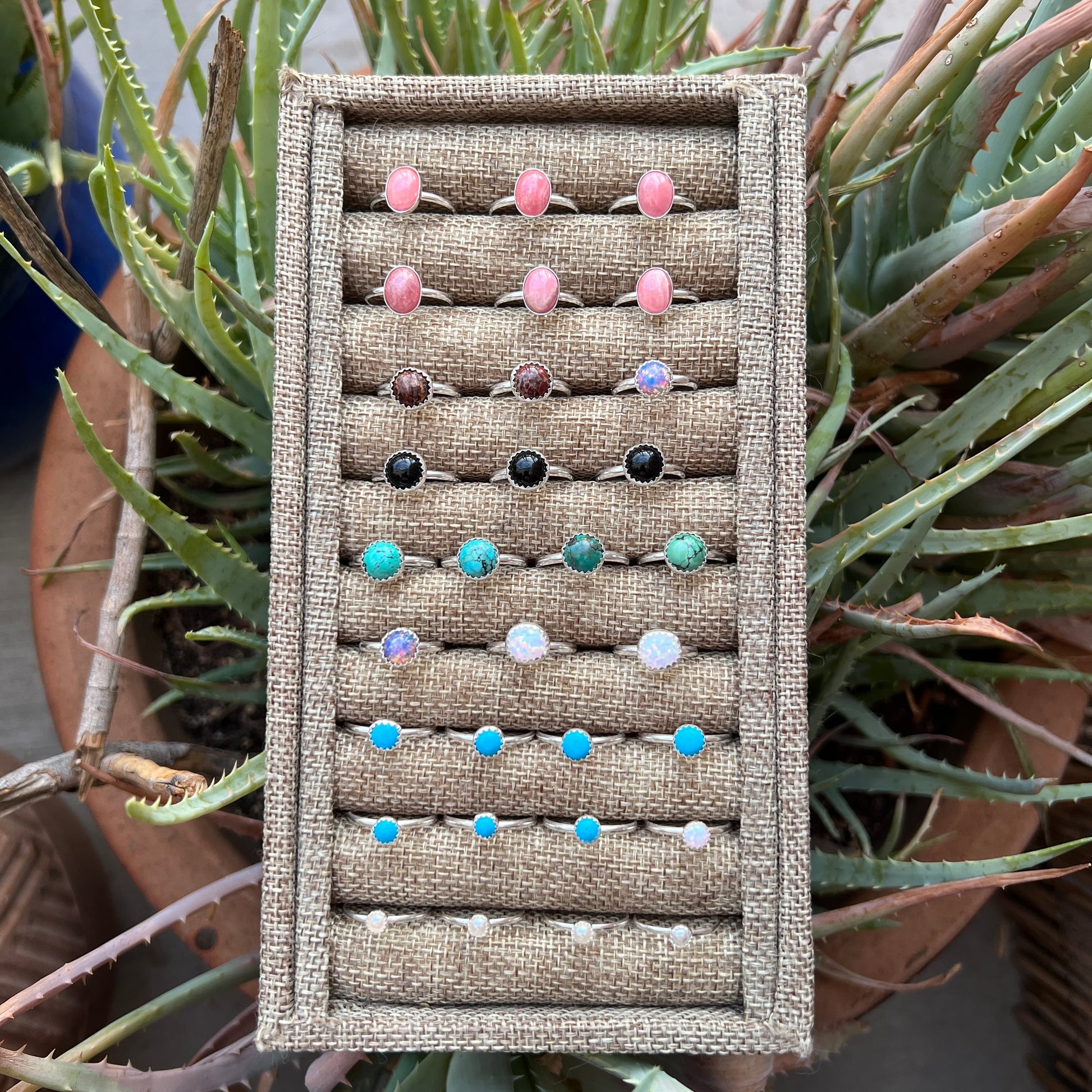 Handmade Sterling Silver skinny stacking rings with Kingman Arizona turquoise in green or blue. Each one of a kind.