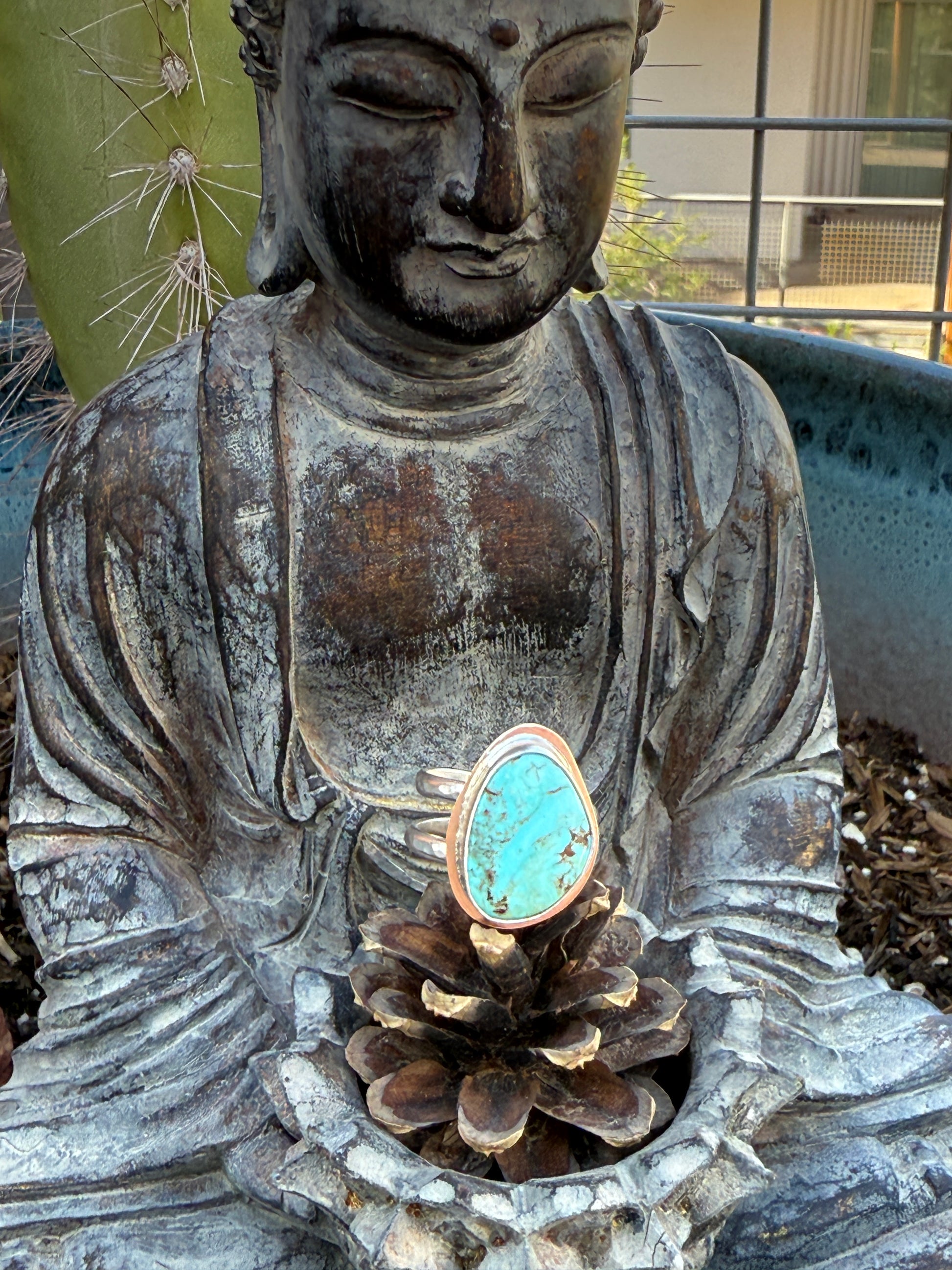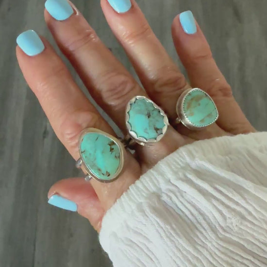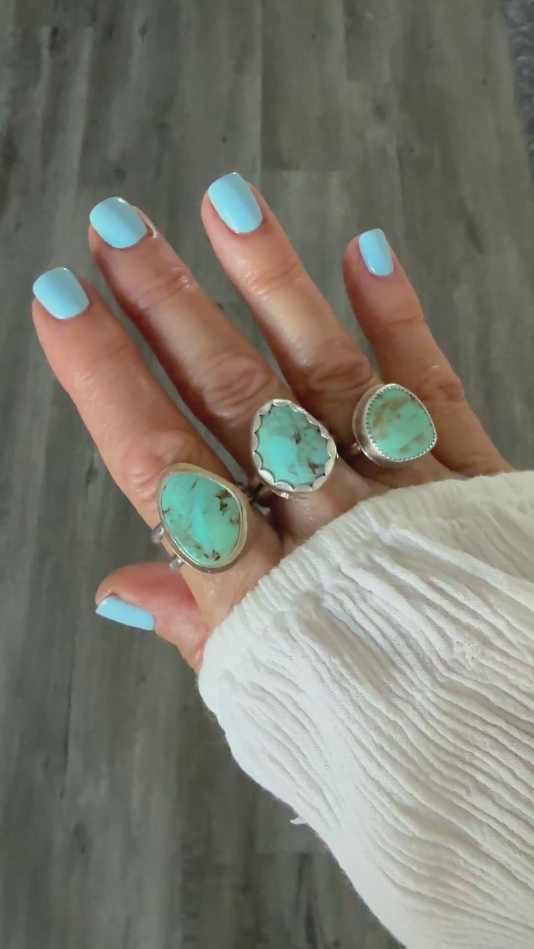 Hand fabricated sterling silver rings with Tyrone turquoise from New Mexico. All of these rings have a Nu Gold backplate. Nu Gold is a specially formulated variation of brass that resembles gold.